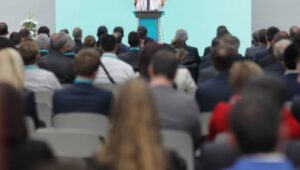 Male doctor giving a speech on a podium at a conference in front of an audience